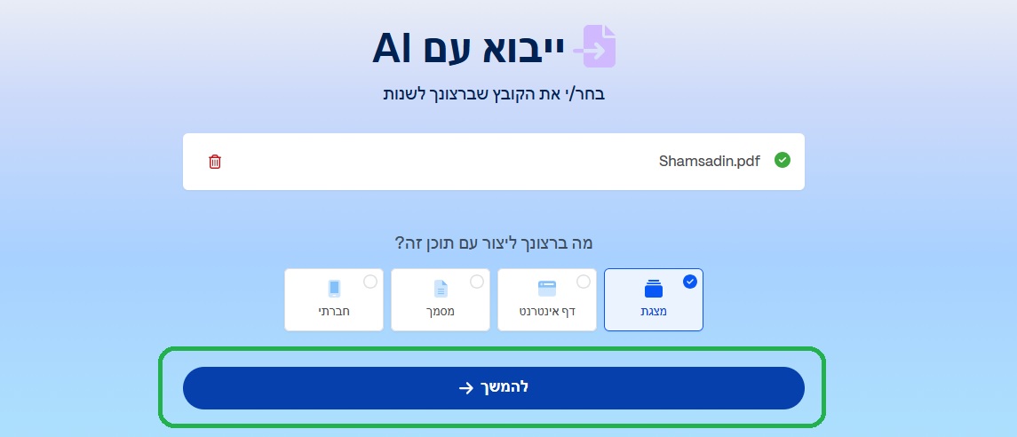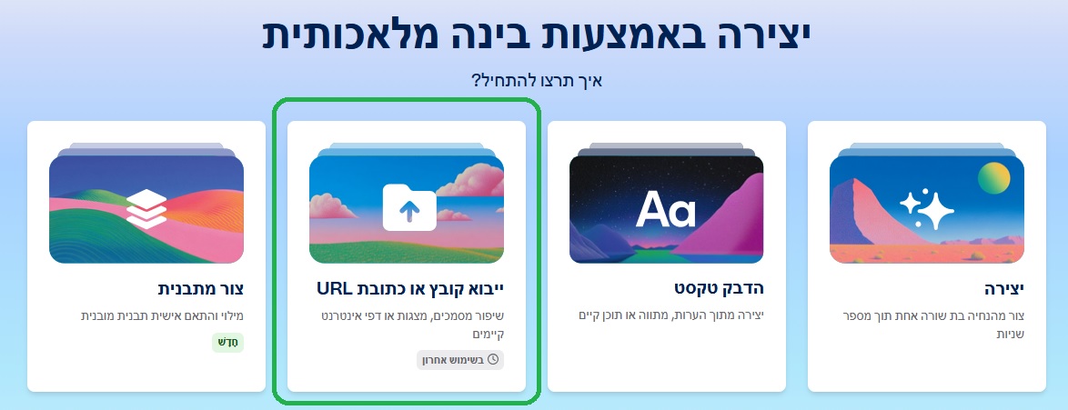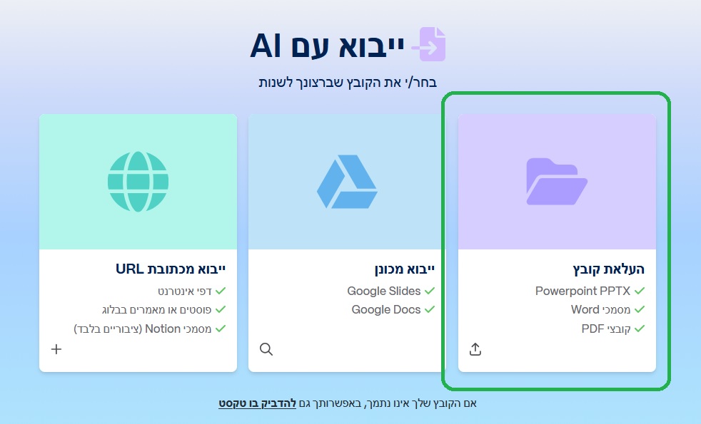 האפשרות השלישית "ייבוא קובץ או כתובת URL" מאפשרת לכם ליצור מצגת מכל קובץ, למשל: מאמר אקדמי, עבודה שהכנתם, מאמר מקצועי, מדריך מקצועי וכדומה – לא משנה אם הם נמצאים אצלכם בקובץ או באינטרנט – ואז אפשר פשוט להדביק קישור.