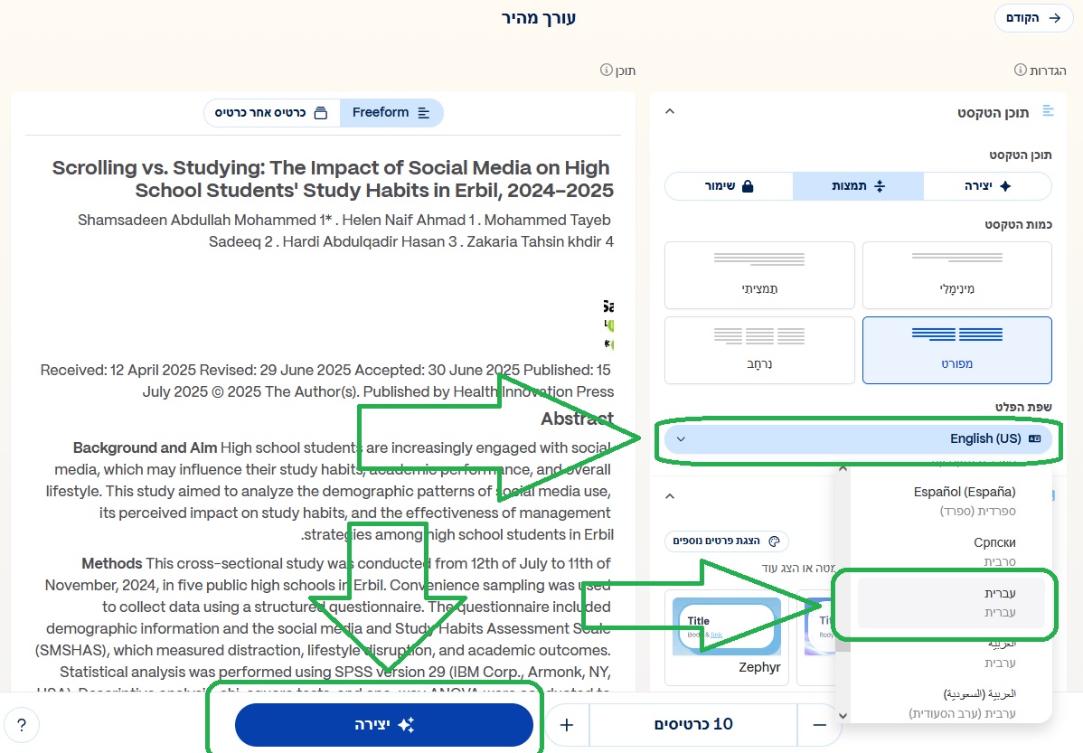 כאן שימו לב כי מכיוון שהמאמר שהעליתי הוא באנגלית, גמא מציעה כברירת מחדל ליצור את המצגת באנגלית. כל מה שצריך לעשות זה ללחוץ על רשימת השפות ולבחור "עברית". לאחר מכן, לחצו על "יצירה", והמערכת תיצור עבורכם את המצגת, כולל תוכן, עיצוב, תמונות והכל!
