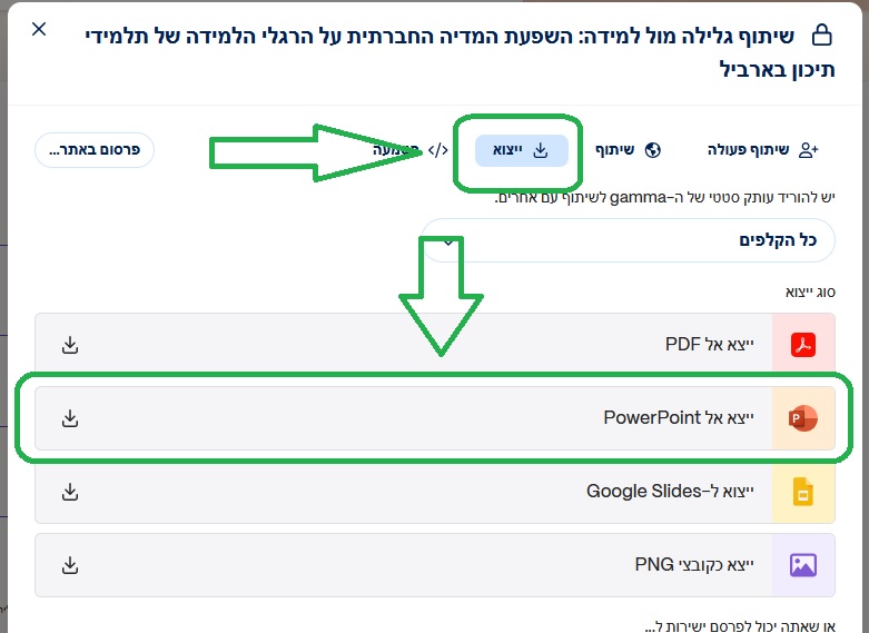 בחלונית שנפתחת בחרו ב"ייצוא" ואז "ייצוא אל PowerPoint" וזהו! תוך כמה שניות המצגת יורדת אליכם למחשב!